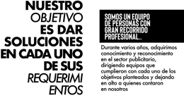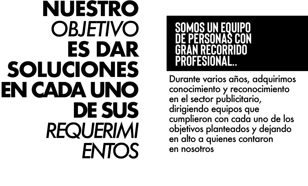 Somos un equipo de personas con gran recorrido profesional, durante varios años adquirimos conocimiento y reconocimiento en el sector publicitario, logrando liderar equipos que cumplieron con los resultados esperados por el cliente y dejando en alto a quienes confiaron en nosotros.